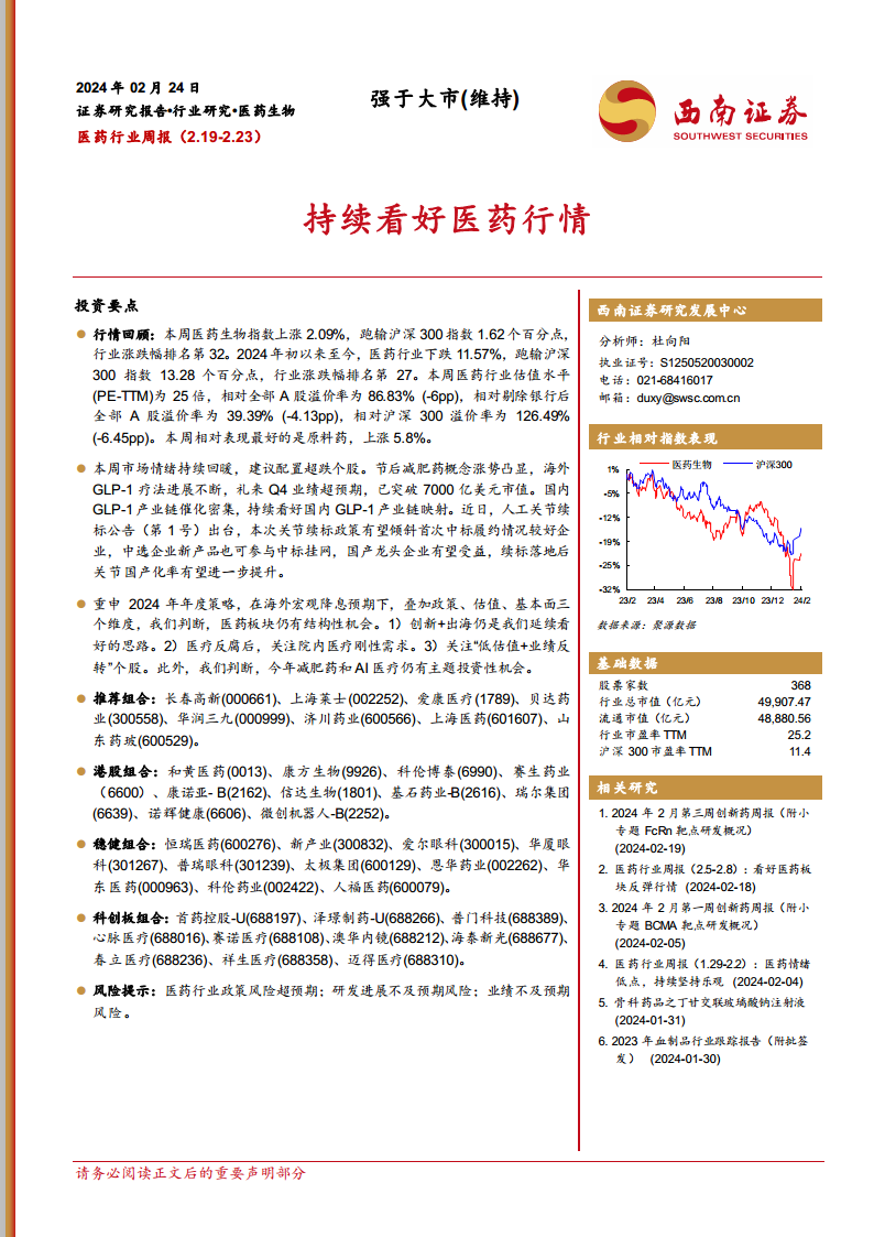 西南证券研究发展中心提供了全面的研究报告体系,包括每周的行业周报、创新药周报,以及针对核心公司的深度报告(涵盖A股、港股、科创板和海外市场)。此外,还有精选的行业专题报告,内容覆盖年度/中期投资策略、季度业绩前瞻与总结、基金持仓分析、医保国谈与集采专题、中药配方颗粒与创新药、CXO行业、创新器械(如骨科、内窥镜、睡眠呼吸护理、影像、CGM、手术机器人等)、药房自动化、制药设备及耗材、供应链自主可控、血制品、疫苗(流感、带状疱疹、HPV、mRNA等)、新冠专题(检测、治疗)、以及政策解读、批签发数据(血制品、疫苗)、ASCO/CSCO会议梳理、合成生物学、医疗服务(眼科、牙科、辅助生殖)、连续性反应、AI医疗、GLP-1RA等前沿热点。这些报告为投资者提供了多维度、深层次的市场分析和投资参考,体现了专业、全面的研究支持。