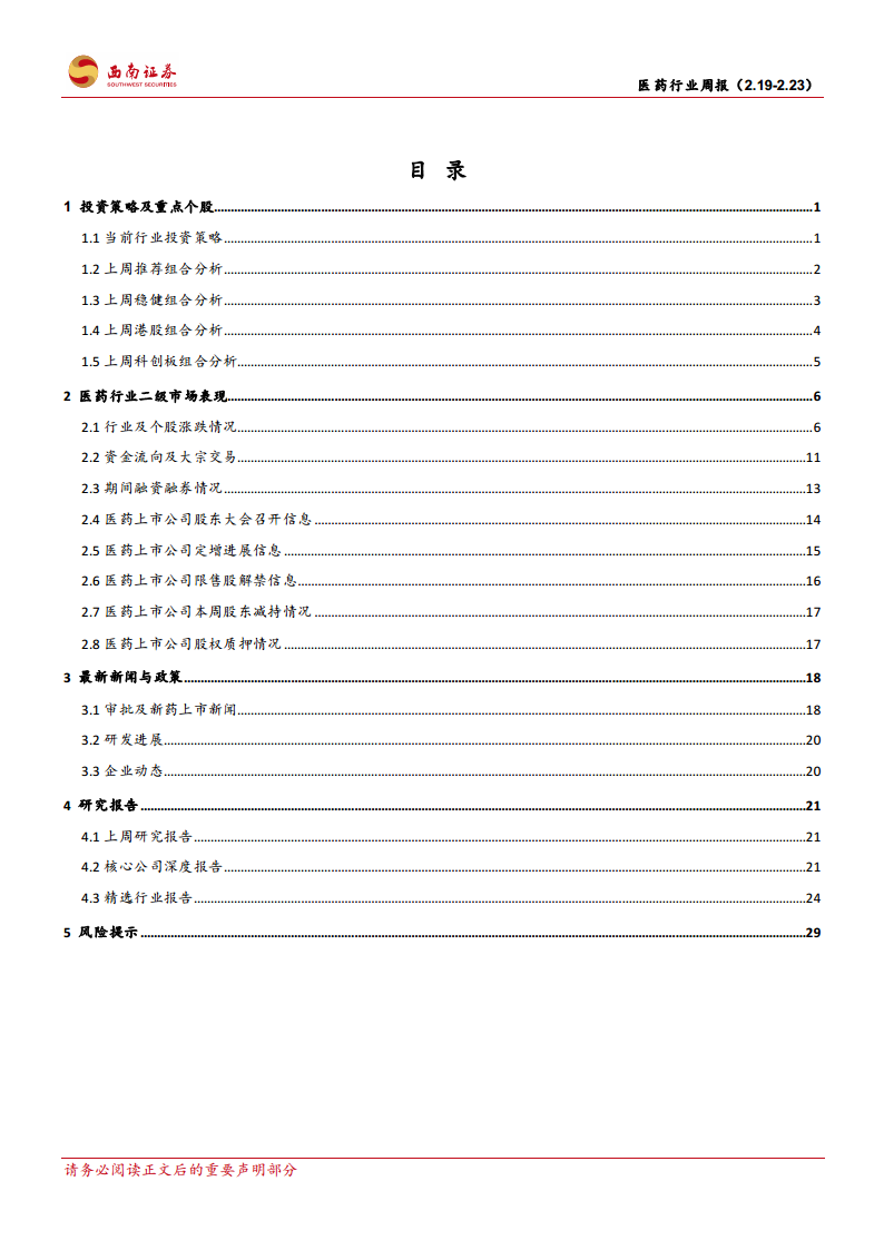 本周(2.19-2.23)医药生物指数上涨2.09%,但同期跑输沪深300指数1.62个百分点,在所有行业中排名第32。从年初至今的表现来看,医药行业累计下跌11.57%,大幅跑输沪深300指数13.28个百分点,行业涨跌幅排名第27,显示出年初以来医药板块的整体承压态势。在估值方面,本周医药行业PE-TTM为25倍,相对全部A股的溢价率为86.83%,较上周下降6个百分点;相对剔除银行后的全部A股溢价率为39.39%,下降4.13个百分点;相对沪深300溢价率为126.49%,下降6.45个百分点。尽管溢价率有所收窄,但医药板块仍保持较高的相对估值,反映了市场对其长期增长潜力的认可。