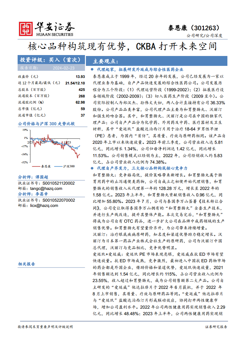 泰恩康(301263):核心品种构筑现有优势,CKBA打开未来空间