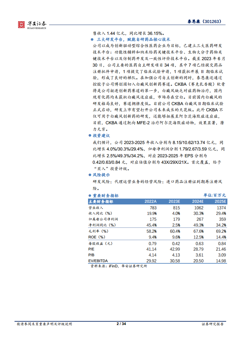 华安证券预计泰恩康2023-2025年收入分别为8.15/10.62/13.74亿元,同比增长4.0%/30.3%/29.4%;归母净利润分别为1.79/2.67/3.59亿元,同比增长2.5%/49.3%/34.2%。对应2023-2025年EPS分别为0.42/0.63/0.84元,对应估值分别为43X/29X/21X。基于公司核心品种构筑的现有优势和CKBA创新药打开的未来成长空间,华安证券首次覆盖并给予“买入”投资评级。
