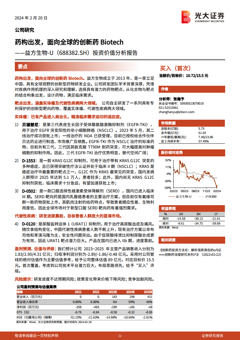 益方生物作为一家专注于创新药研发的Biotech公司,凭借其深厚的研发实力和前瞻性的产品布局,在肿瘤和代谢性疾病领域取得了显著进展。公司已有一款产品成功商业化,并拥有多个处于临床后期且市场需求迫切的创新药管线。尽管目前仍处于亏损阶段,但其独特的商业模式和与合作伙伴的授权合作,使其能够高效利用资源专注于核心研发。基于对核心管线的绝对估值,益方生物展现出巨大的增长潜力,因此给予“买入”评级,并建议关注其商业化产品的放量及后续管线的上市进展。