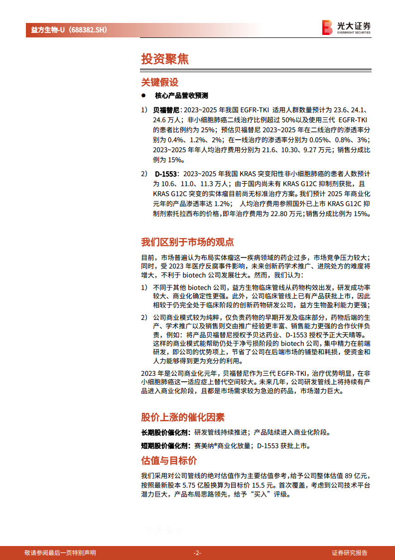 鉴于公司技术平台潜力巨大、产品布局思路领先,首次覆盖给予“买入”评级,目标价为15.5元(对应总估值89亿元,按照最新股本5.75亿股换算)。短期股价催化剂包括赛美纳®的商业化放量和D-1553的获批上市,长期驱动因素为研发管线的持续推进和产品陆续进入商业化阶段。同时,报告提示了研发进度不达预期、政策变化带来价格下降以及市场竞争加剧等风险。