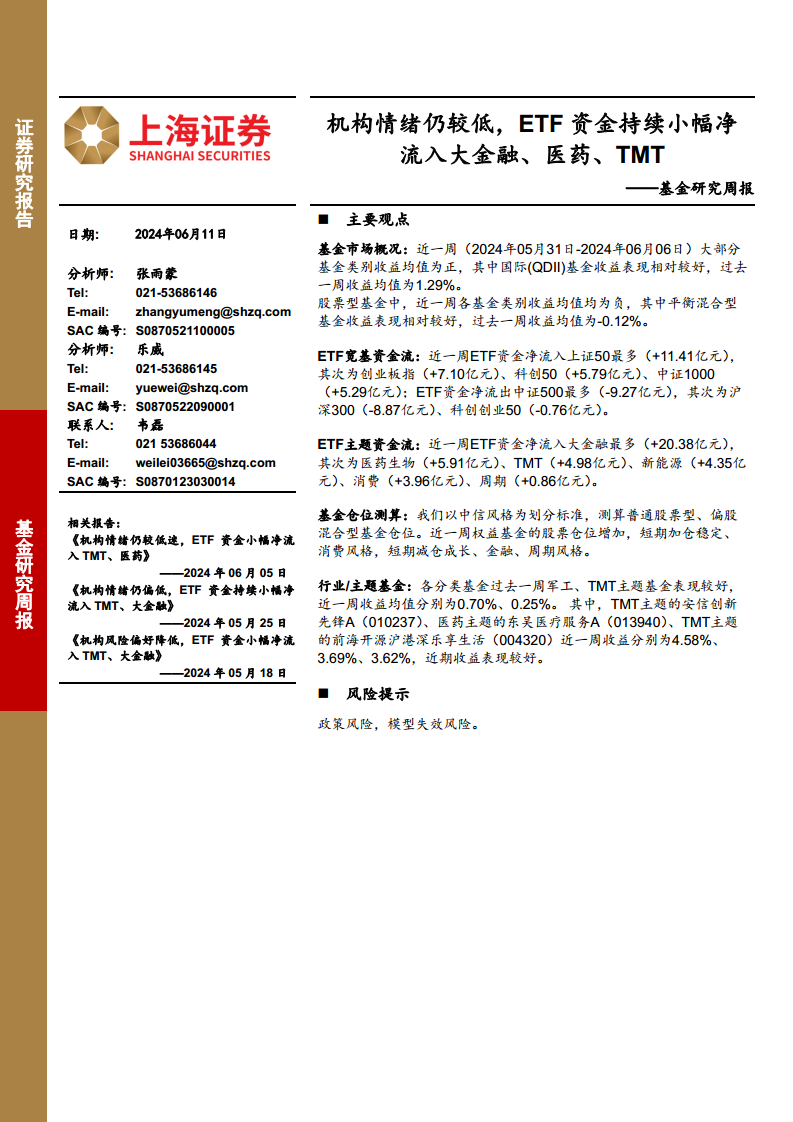 基金研究周报:机构情绪仍较低,ETF资金持续小幅净流入大金融、医药、TMT