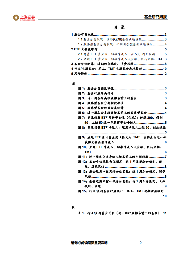 本周基金市场呈现出机构情绪低迷与ETF资金结构性流入并存的特点。国际(QDII)基金表现亮眼,而股票型基金整体承压,其中平衡混合型基金相对稳健。ETF资金主要流入上证50、创业板指等宽基指数以及大金融、医药生物、TMT等主题板块。权益基金在仓位调整上偏向稳定和消费风格,并增持医药、食品饮料等行业。军工和TMT主题基金表现较好,显示出市场对特定领域的关注和配置意愿。投资者需关注政策及模型失效风险。
