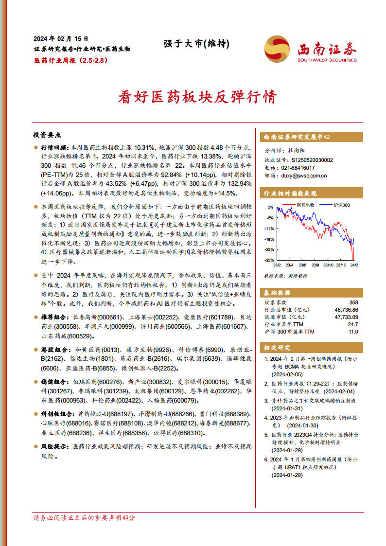 本报告深入分析了2024年2月5日至2月8日期间医药生物行业的市场表现、投资策略及最新动态。核心观点指出,本周医药板块经历了一次显著的强势反弹,其表现远超大盘,主要驱动因素包括前期估值处于历史底部、一系列积极的政策利好、创新药国际化进程的不断催化,以及医疗器械集采政策的温和化趋势。这些因素共同作用,有效提振了市场信心,促使资金回流医药板块。