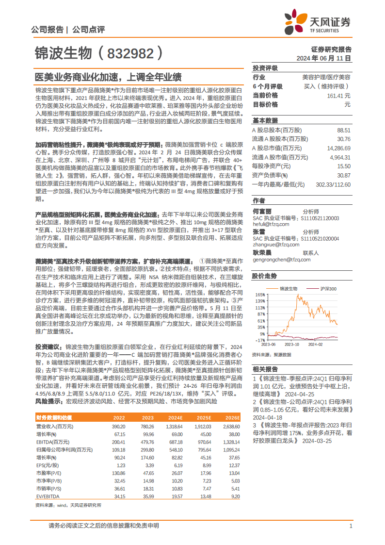 锦波生物作为重组胶原蛋白领域的领军企业,2024年是其商业化进阶的关键一年。公司通过C端营销强化品牌心智,B端深耕大客户提升复购,医美业务已进入正循环阶段。考虑到行业红利持续释放、新规格产品商业化加速以及未来在研管线的商业化前景,分析师上调了公司2024-2026年的归母净利润预测,分别由4.95/6.8/8.9亿元上调至5.5/8.0/11.0亿元,对应PE分别为26/18/13X,维持“买入”评级。