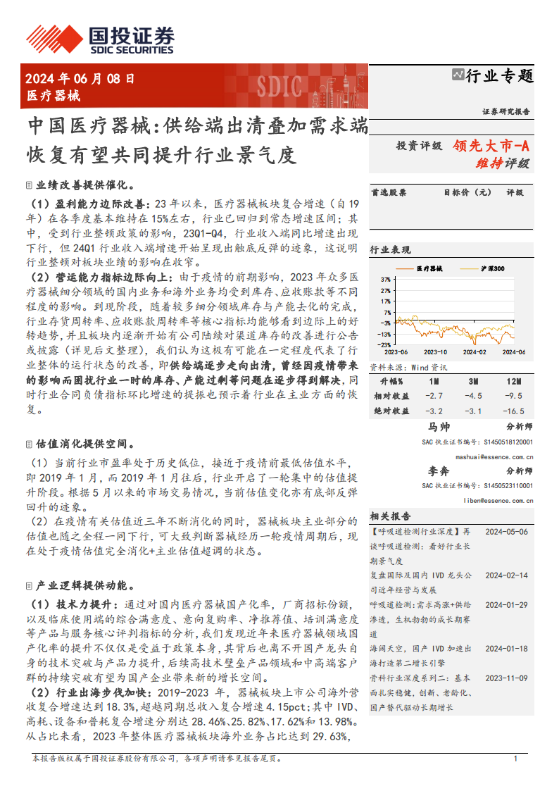 中国医疗器械:供给端出清叠加需求端恢复有望共同提升行业景气度