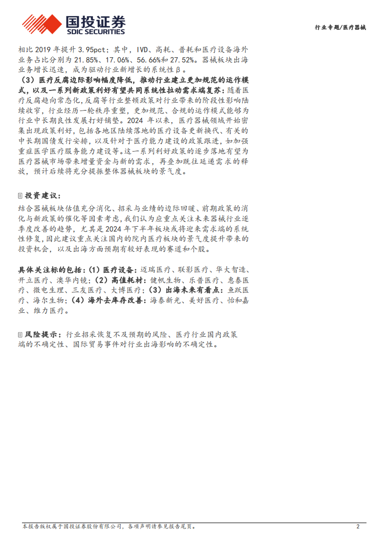 综上所述,中国医疗器械行业正处于一个多重积极因素叠加的拐点。供给端的库存出清和营运能力改善,需求端在政策利好和延递需求释放下的系统性复苏,以及估值处于历史低位带来的修复空间,共同构成了行业景气度回升的坚实基础。此外,国产厂商在技术创新和国际化方面的持续努力,也为行业提供了长期的增长动能。因此,报告建议重点关注国内院内医疗板块景气度提升带来的投资机会,以及出海表现良好的赛道和个股,如迈瑞医疗、联影医疗、健帆生物、鱼跃医疗等。同时,需警惕行业招采恢复不及预期、国内政策不确定性以及国际贸易事件等风险。
