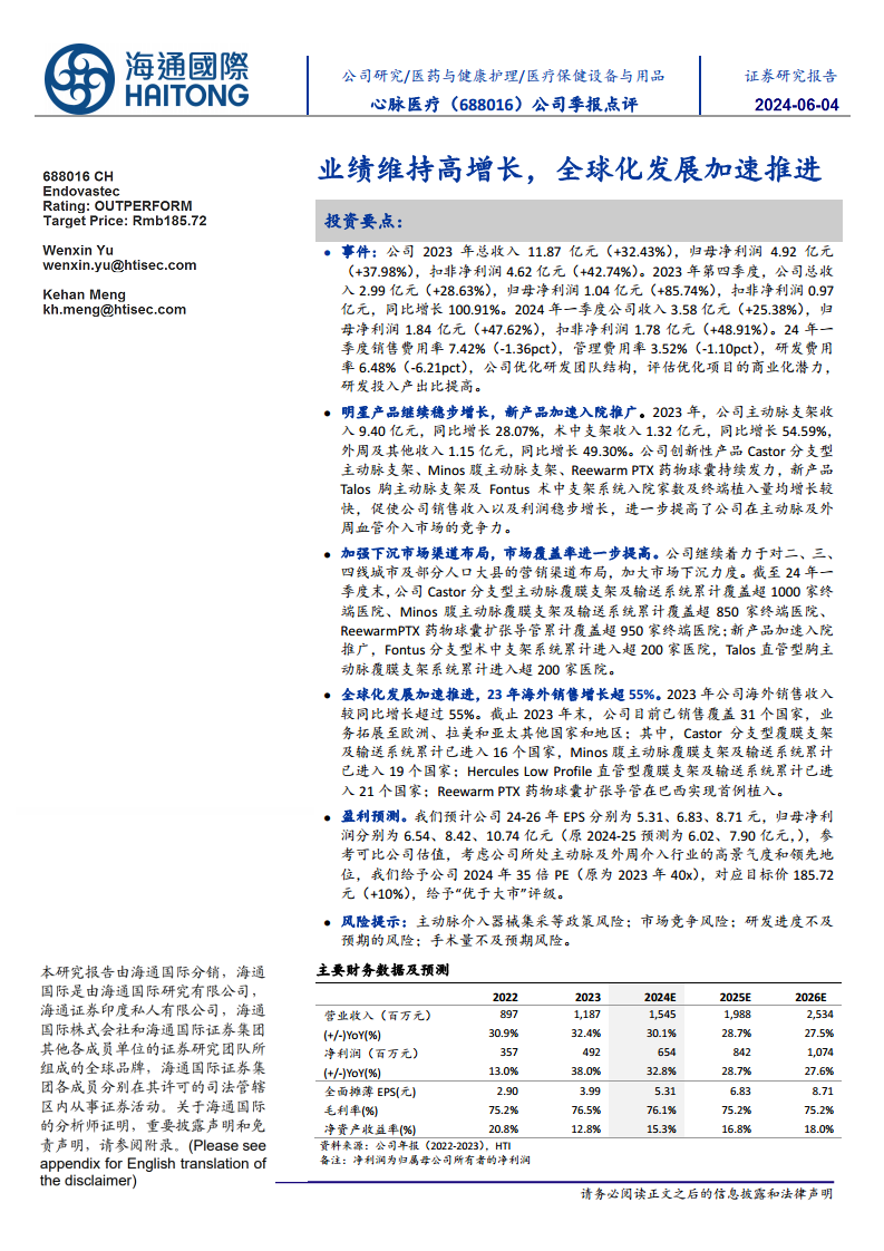 心脉医疗(688016):公司季报点评:业绩维持高增长,全球化发展加速推进