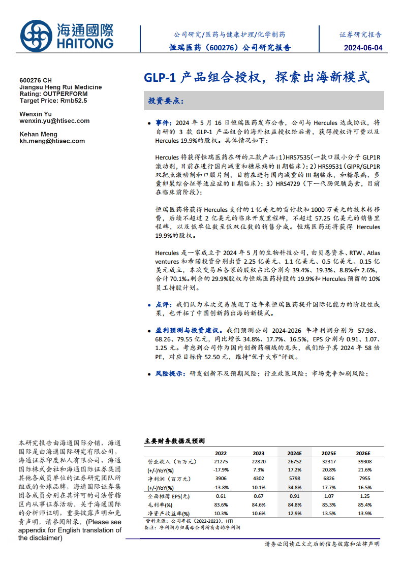 恒瑞医药此次将三款GLP-1产品组合的海外权益授权给Hercules,不仅获得了丰厚的经济回报,更重要的是开辟了中国创新药国际化的新路径,通过股权合作与国际资本深度绑定,加速了全球市场布局。公司财务表现稳健,预计2024-2026年净利润将持续高速增长,创新药业务占比显著提升,进一步巩固了其在国内创新药领域的龙头地位。尽管面临研发、政策和市场竞争等风险,但凭借其强大的研发实力和前瞻性的国际化战略,恒瑞医药展现出良好的发展潜力和投资价值,维持“优于大市”评级。
