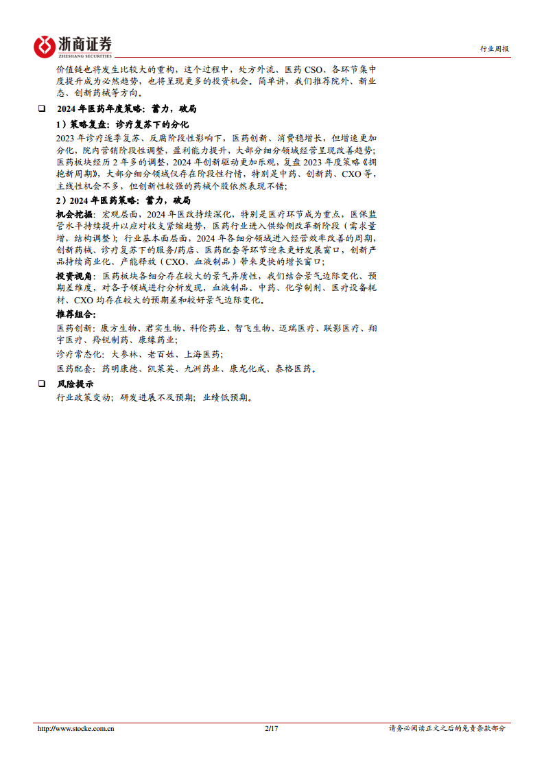 报告回顾了2023年策略,指出诊疗逐季复苏、反腐影响下,医药创新和消费稳增长但增速分化,院内营销调整,盈利能力提升。2024年,宏观层面医改持续深化,医疗环节成为重点,医保监管水平提升以应对收支紧缩,医药行业进入供给侧改革新阶段(需求量增,结构调整)。行业基本面层面,各细分领域进入经营效率改善周期,创新药械、诊疗复苏下的服务/药店、医药配套等环节迎来更好发展窗口,创新产品持续商业化、产能释放(CXO、血液制品)带来更快增长。投资视角上,血液制品、中药、化学制剂、医疗设备耗材、CXO均存在较大预期差和较好景气边际变化。报告推荐了包括康方生物、君实生物、迈瑞医疗等在内的医药创新组合;大参林、老百姓、上海医药等诊疗常态化组合;以及药明康德、凯莱英、泰格医药等医药配套组合。