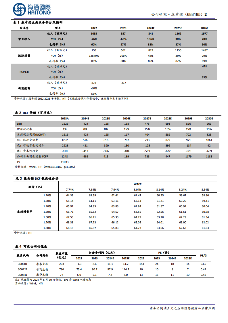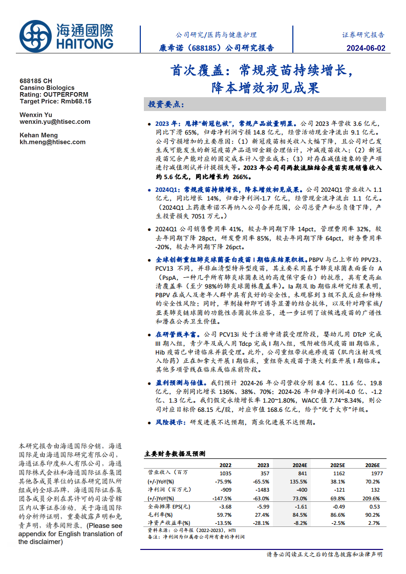 康希诺生物在2023年受新冠疫苗业务拖累,业绩出现大幅下滑并录得巨额亏损。然而,公司已成功甩掉“新冠包袱”,常规疫苗产品(特别是流脑结合疫苗)实现强劲增长,成为新的业绩驱动力。2024年第一季度,公司营收同比增长,且各项费用率显著优化,表明降本增效策略初见成效。在创新方面,全球创新重组肺炎球菌蛋白疫苗(PBPV)的积极临床结果以及丰富的在研管线,为公司未来发展奠定了坚实基础。尽管短期内仍面临亏损,但财务预测显示公司有望在2026年实现盈利,营收将持续高速增长,毛利率也将大幅提升。基于DCF估值模型,报告给予康希诺“优于大市”的评级,肯定了其长期增长潜力,但研发和商业化进展仍需密切关注。