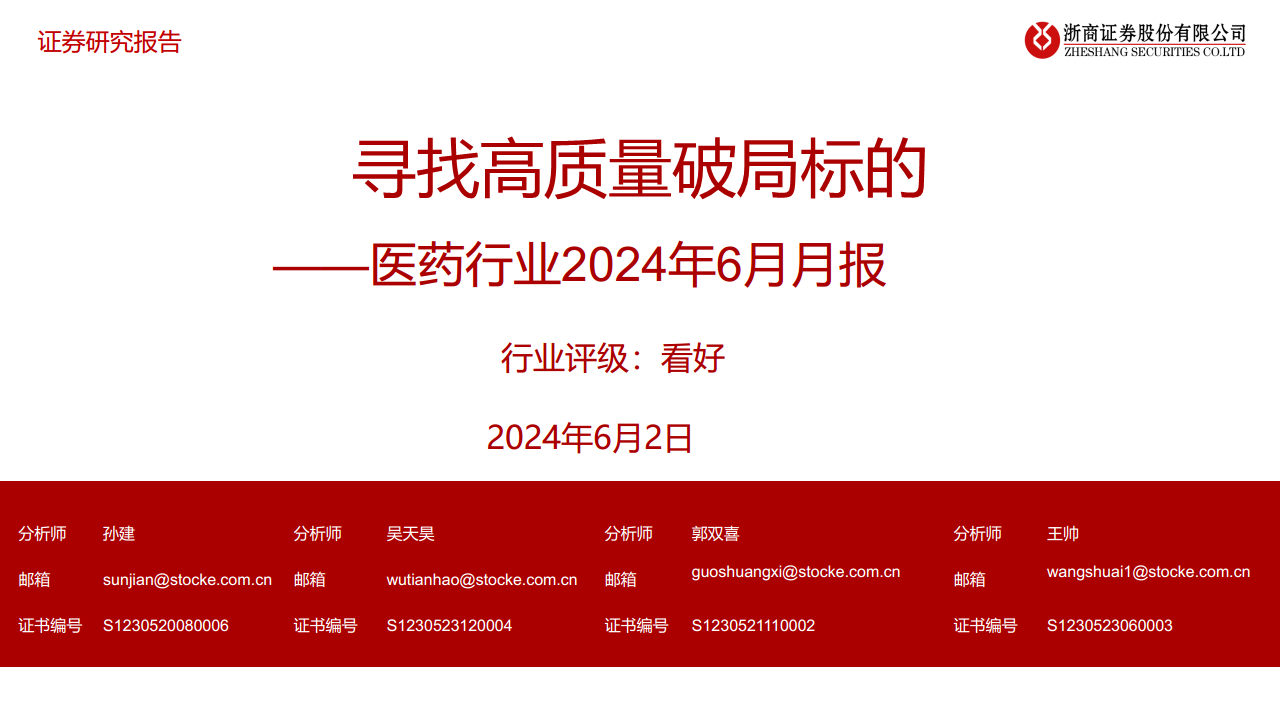 报告为6月医药行业投资提供了三大破局方向:一是受益于央国企改革,短期业绩和长期发展可能超预期、基本面持续改善的标的;二是平台效应显现、海外增长曲线清晰、具备显著α能力的标的;三是受投融资影响较小、仿制药研发高景气度受益的仿制药CRO企业。这些方向旨在帮助投资者在行业调整期中寻找高质量的增长机会。