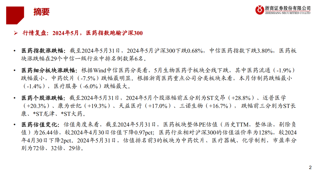 本报告核心观点指出,2024年5月医药板块整体表现持续承压,跑输沪深300指数,且估值有所下降。面对市场缺乏明确主线的现状,报告强调应从长期投资视角出发,依据PB-ROE标准,精选基本面优异、具备稳定良性增长潜力的标的。