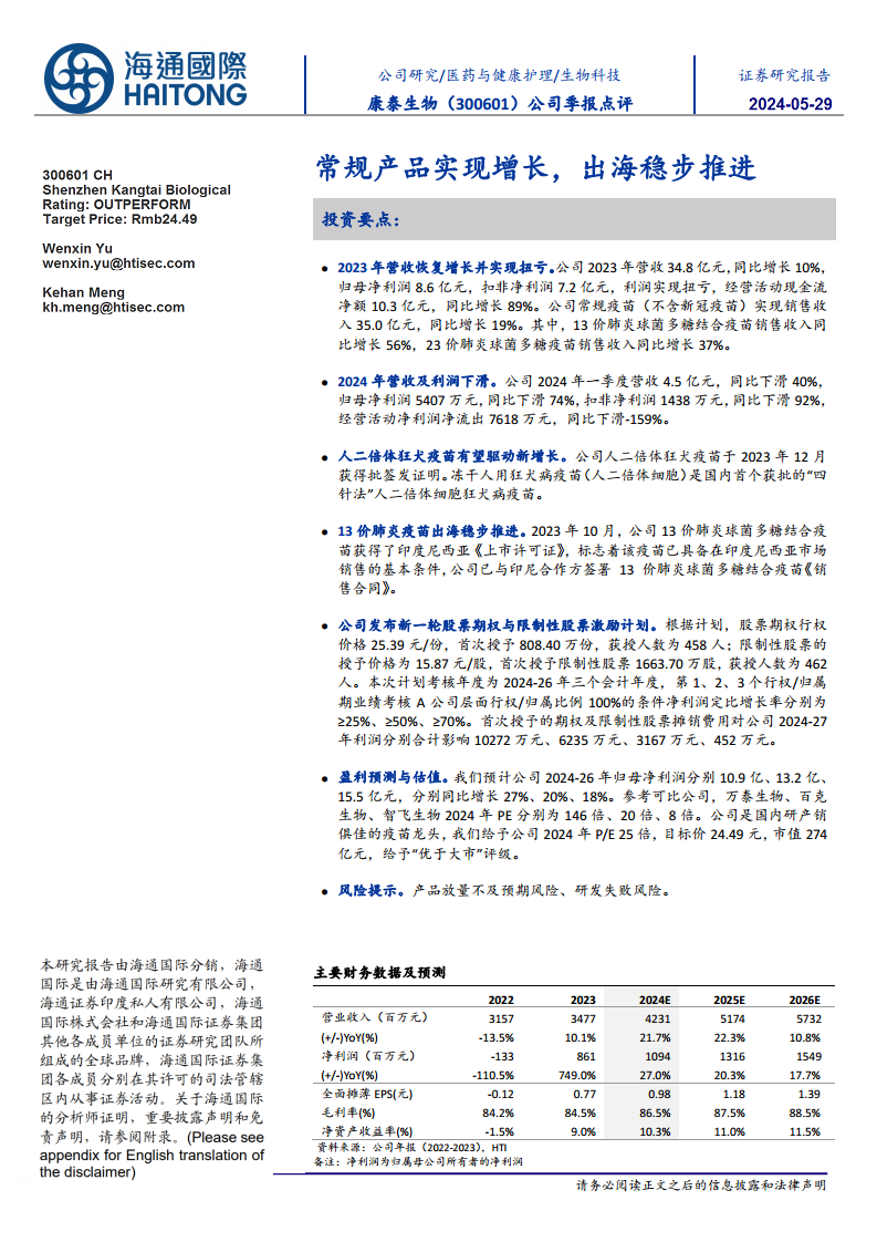 康泰生物在2023年通过常规疫苗产品的强劲销售和有效的成本控制实现了业绩的显著反弹和扭亏为盈。尽管2024年一季度面临短期业绩压力,但公司在人二倍体狂犬疫苗等创新产品上的突破以及13价肺炎疫苗的国际化进展,为未来的可持续增长提供了坚实基础。新推出的股权激励计划将进一步激发公司内部活力,确保长期发展目标的实现。分析师对公司未来盈利能力持乐观态度,并给予“优于大市”评级,但需关注产品放量不及预期和研发失败等风险。