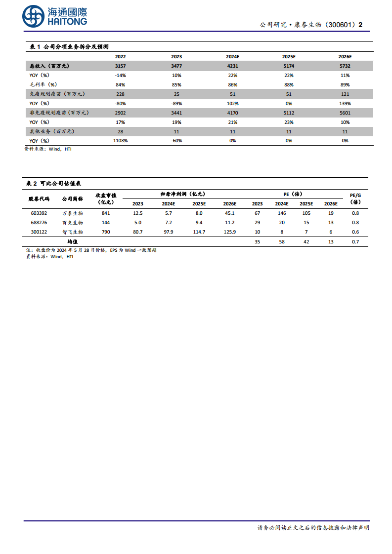 基于公司现有产品线和未来发展潜力,分析师预计康泰生物2024-2026年归母净利润将分别达到10.9亿元、13.2亿元和15.5亿元,同比增长率分别为27%、20%和18%。参考可比公司(万泰生物、百克生物、智飞生物2024年PE分别为146倍、20倍、8倍),分析师给予康泰生物2024年25倍P/E,目标价24.49元,对应市值274亿元,并维持“优于大市”评级。