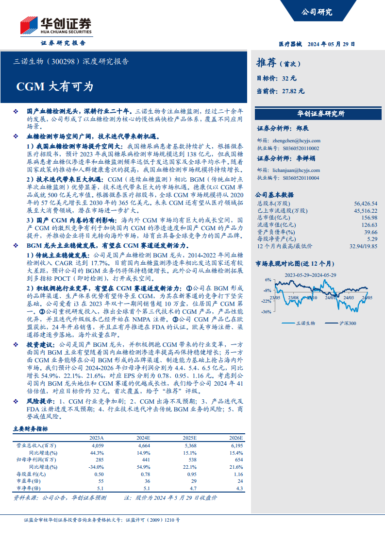基于对BGM业务的稳健增长和CGM业务的高速增长预期,华创证券预测三诺生物2024-2026年归母净利润分别为4.4亿元、5.4亿元、6.5亿元,同比增长54.9%、22.1%、21.6%,对应EPS分别为0.78元、0.95元、1.16元。考虑到公司在国内BGM市场的龙头地位以及CGM赛道的优越成长性,给予公司2024年41倍估值,对应目标价约32元,首次覆盖给予“推荐”评级。
