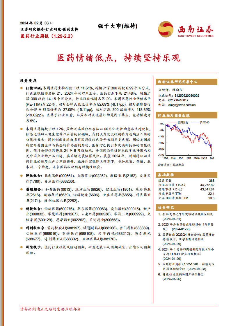 报告维持对医药行业“强于大市”的评级,并持续坚持乐观态度。在海外宏观降息预期下,叠加政策、估值、基本面三个维度,未来医药板块仍有结构性机会。报告推荐了多个组合: