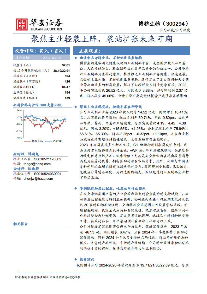 博雅生物作为血液制品老牌企业,在华润集团的赋能下,通过优化业务结构、聚焦主业,其血液制品业务展现出稳健增长的潜力。公司在研管线丰富,高浓度静丙、C1酯酶抑制剂、vWF因子等新品的推进将为未来业绩提供新的增长点。华润集团的产业资源和资金实力将显著提升公司浆站拓展能力,预计2024年全年采浆量增速将达两位数,吨浆效率和吨浆毛利均位于行业前列,保持良好的竞争力和盈利能力。