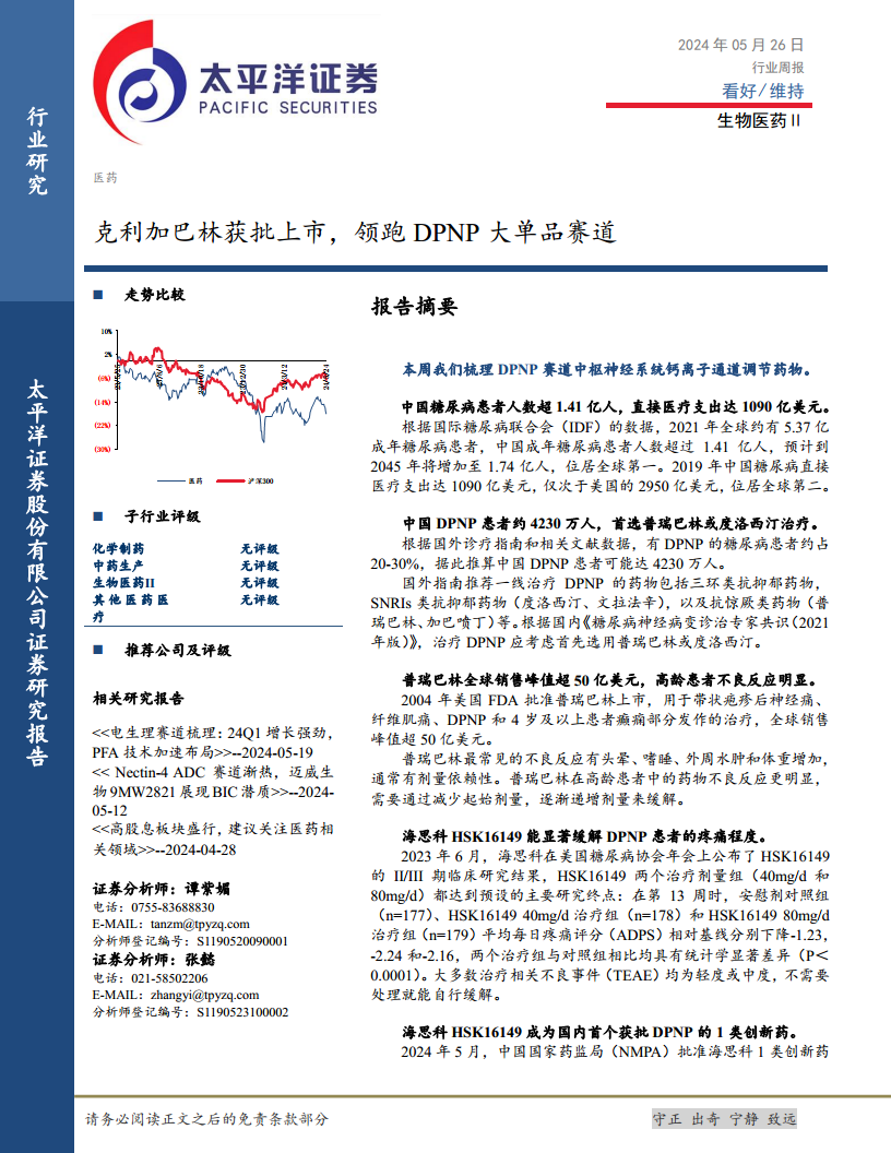 生物医药行业周报:克利加巴林获批上市,领跑DPNP大单品赛道