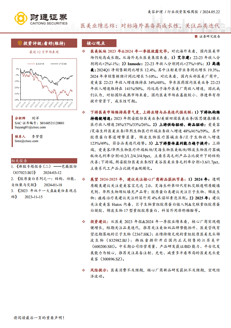 - 短期关注: 品类迭代、新品所处周期、覆盖渠道及销售能力。2024年第二季度及全年市场有多款新品有望上市,需关注已上市产品放量情况及待上市产品获批节奏。推荐关注美妆双品牌势能抬升、医美管线有望近期落地的巨子生物(2367.HK);业绩持续兑现的重组胶原医美龙头锦波生物(832982.BJ);韩版童颜针开启国内正式销售的江苏吴中(600200.SH)。