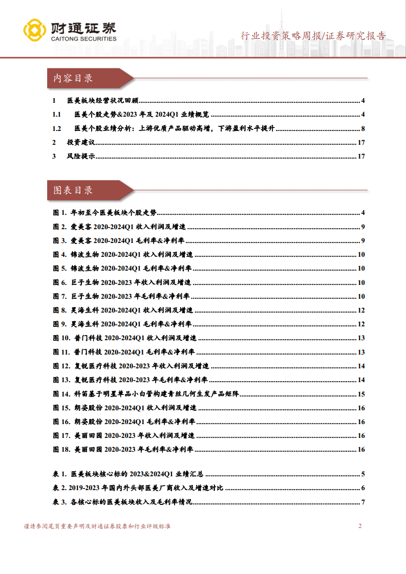 - 锦波生物: 2023年收入7.8亿元(+100%),归母净利润3.0亿元(+175%);2024Q1收入2.3亿元(+76%),归母净利润1.0亿元(+136%)。薇旖美产品线多型别多规格布局,向平台化企业迈进。妇科产品、面中部增容产品、重组ⅩⅦ型人源化胶原蛋白产品等在研管线稳步推进。