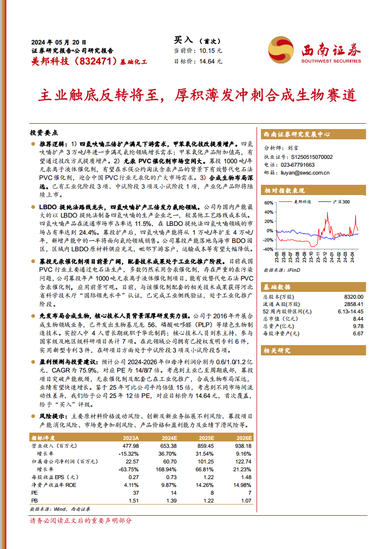 美邦科技(832471)作为一家深耕绿色化工领域的领先企业,正迎来业绩触底反转的关键时期。公司凭借其在四氢呋喃(THF)和甲苯氧化系列产品方面的核心技术优势,以及在无汞PVC催化剂和合成生物领域的战略性前瞻布局,构建了多重增长引擎。当前,公司主营业务已至周期底部,募投项目即将投产,新业务的逐步落地有望驱动公司业绩实现快速增长,展现出显著的投资价值。
