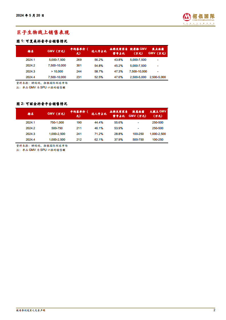 巨子生物旗下的核心品牌可复美在2024年持续发力,围绕肌肤亚健康问题重点打造了焦点系列,并密集推出了焦点面霜、焦点精华、焦点涂抹面膜和焦点面膜等多款新品。这些产品创新性地采用了天然序列重组I型胶原蛋白、天然序列重组III型胶原蛋白、重复序列重组I型胶原蛋白和Mini小分子重组I型胶原蛋白肽的仿生组合,旨在协同修护皮肤屏障、增强皮肤弹性,并实现紧致抗皱及亮肤保湿等多重功效。市场对焦点系列反响热烈,其中可复美焦点面霜已蝉联天猫面霜新品榜榜首,并名列天猫面霜热销榜第11位、天猫面霜好评榜第8位。根据婵妈妈的数据,2024年4月,可复美焦点面霜在抖音平台的销售额已达到2,500-5,000万元人民币,初步展现出成为大单品的潜力。此外,可复美还推出了秩序系列的新品秩序面膜和秩序清洁泥膜,以及胶原修护系的新品胶原冻膜,并对可复美柔肤水3.0进行了升级,进一步完善了产品矩阵。