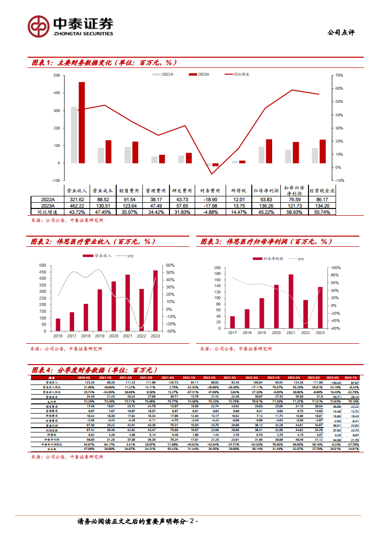 伟思医疗在2023年实现了显著的业绩增长,营业收入和归母净利润同比增幅均超过40%,主要得益于磁刺激产品持续放量以及激光射频等新兴业务的快速发展。公司通过不断迭代传统优势产品并积极布局新管线,展现出强大的市场适应性和增长潜力。