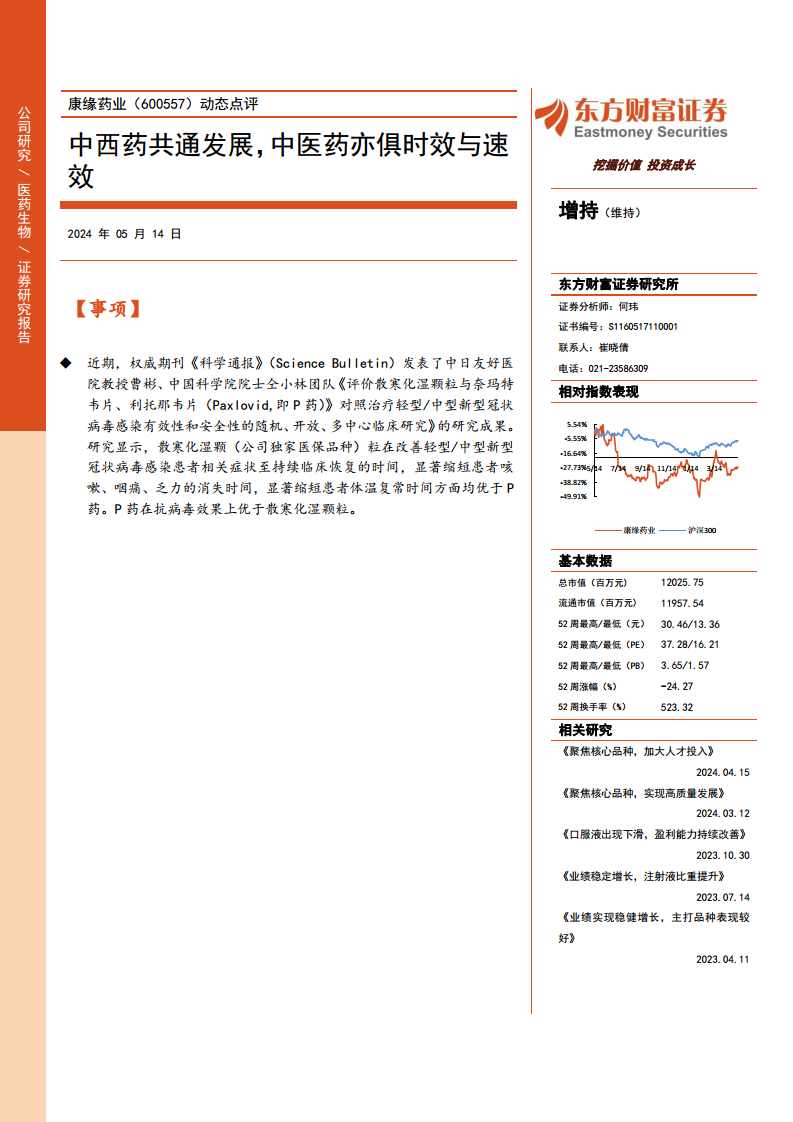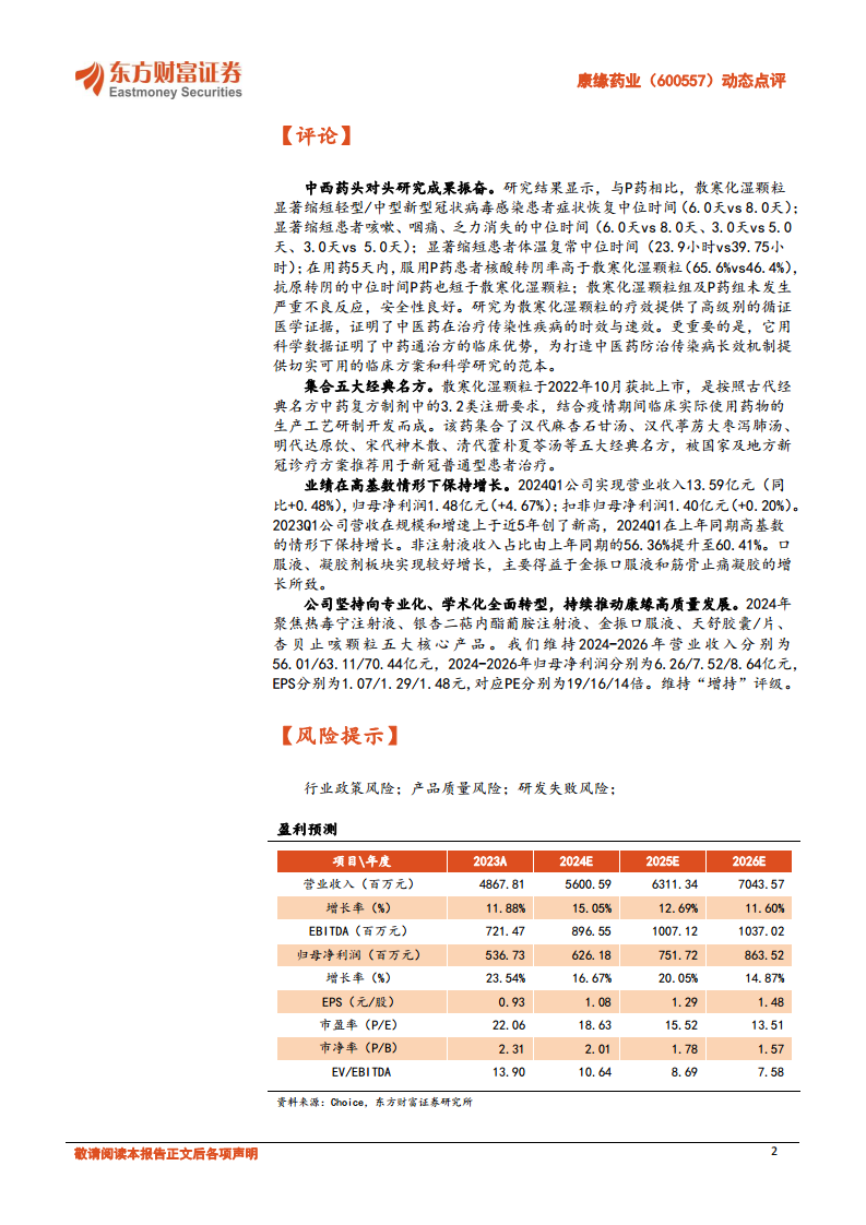 康缘药业近期在《科学通报》上发表的散寒化湿颗粒与Paxlovid的头对头临床研究成果,以高级别循证医学证据有力证明了中医药在治疗轻/中型新冠感染症状方面的显著优势和良好安全性,为中医药的现代化和国际化发展奠定了坚实基础。尽管面临2023年第一季度的高基数挑战,公司在2024年第一季度仍实现了营业收入和归母净利润的稳健增长,非注射液业务占比提升,口服液和凝胶剂产品表现突出。公司正积极推进专业化、学术化转型,并战略聚焦于热毒宁注射液、银杏二萜内酯葡胺注射液、金振口服液、天舒胶囊/片、杏贝止咳颗粒五大核心产品,以期实现高质量发展。分析师维持对康缘药业的“增持”评级,并对其未来盈利能力持乐观预期,但同时提示了行业政策、产品质量和研发失败等潜在风险。