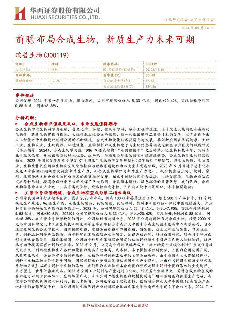 瑞普生物(300119):前瞻布局合成生物,新质生产力未来可期