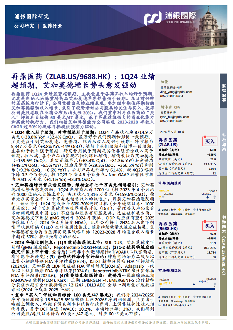 再鼎医药2024年第一季度业绩表现强劲,显著超出市场预期,主要得益于核心产品艾加莫德的爆发式增长以及其他产品的稳健贡献。艾加莫德作为公司实现2023-2028年收入复合年增长率超过50%战略目标的关键驱动力,其市场渗透和适应症拓展进展顺利。展望2024年,公司拥有一系列重要的药物获批、上市申请和临床数据读出等催化剂,有望进一步推动其增长。尽管存在销售不及预期、临床进度延误等风险,但浦银国际基于公司强大的商业化能力和未来增长潜力,维持“买入”评级和目标价,预计公司将逐步实现盈利并持续创造价值。