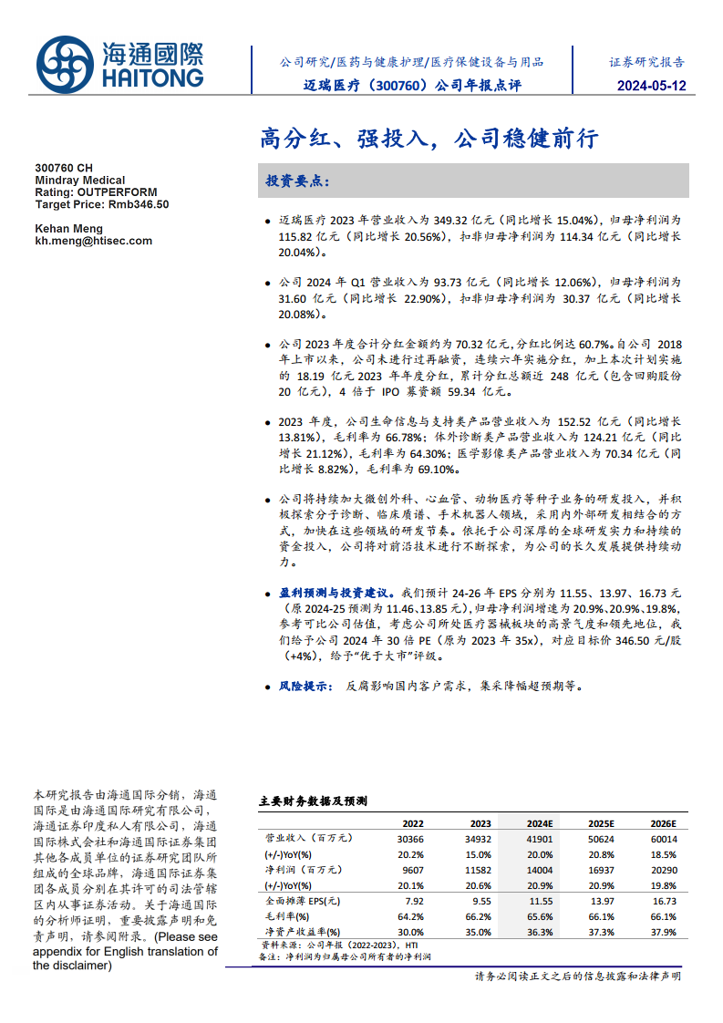 迈瑞医疗(300760):高分红、强投入,公司稳健前行