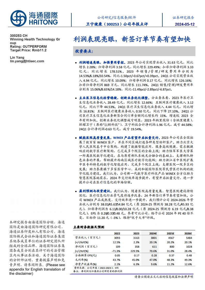 卫宁健康在2023年及2024年第一季度展现出强劲的盈利增长,主要得益于有效的费用管控和核心医疗卫生信息化业务的稳健发展。尽管互联网医疗健康业务有所下滑,但创新业务的亏损已显著收窄。公司新一代WiNEX产品在市场拓展中取得积极进展,并有望在2024年实现批量交付,进一步巩固其市场地位。鉴于行业景气度改善和公司产品优势,报告维持“优于大市”评级,并对未来业绩持乐观预期,但同时提示了行业需求和创新业务持续亏损的风险。