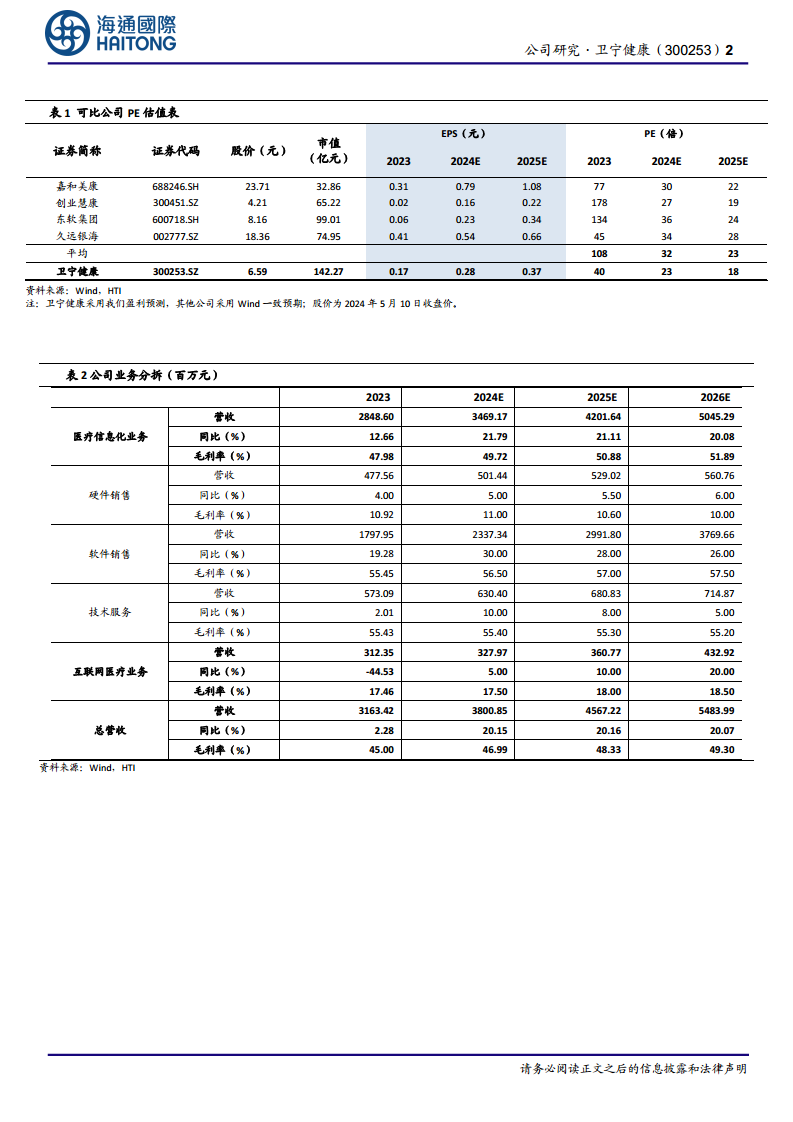 报告参考可比公司(如嘉和美康、创业慧康、东软集团、久远银海)的平均估值水平,给予卫宁健康2024年40倍PE。基于此,目标价设定为11.20元(较当前股价有一定提升空间),并维持“优于大市”的投资评级。