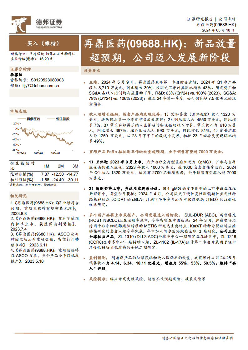 再鼎医药(09688):新品放量超预期,公司迈入发展新阶段