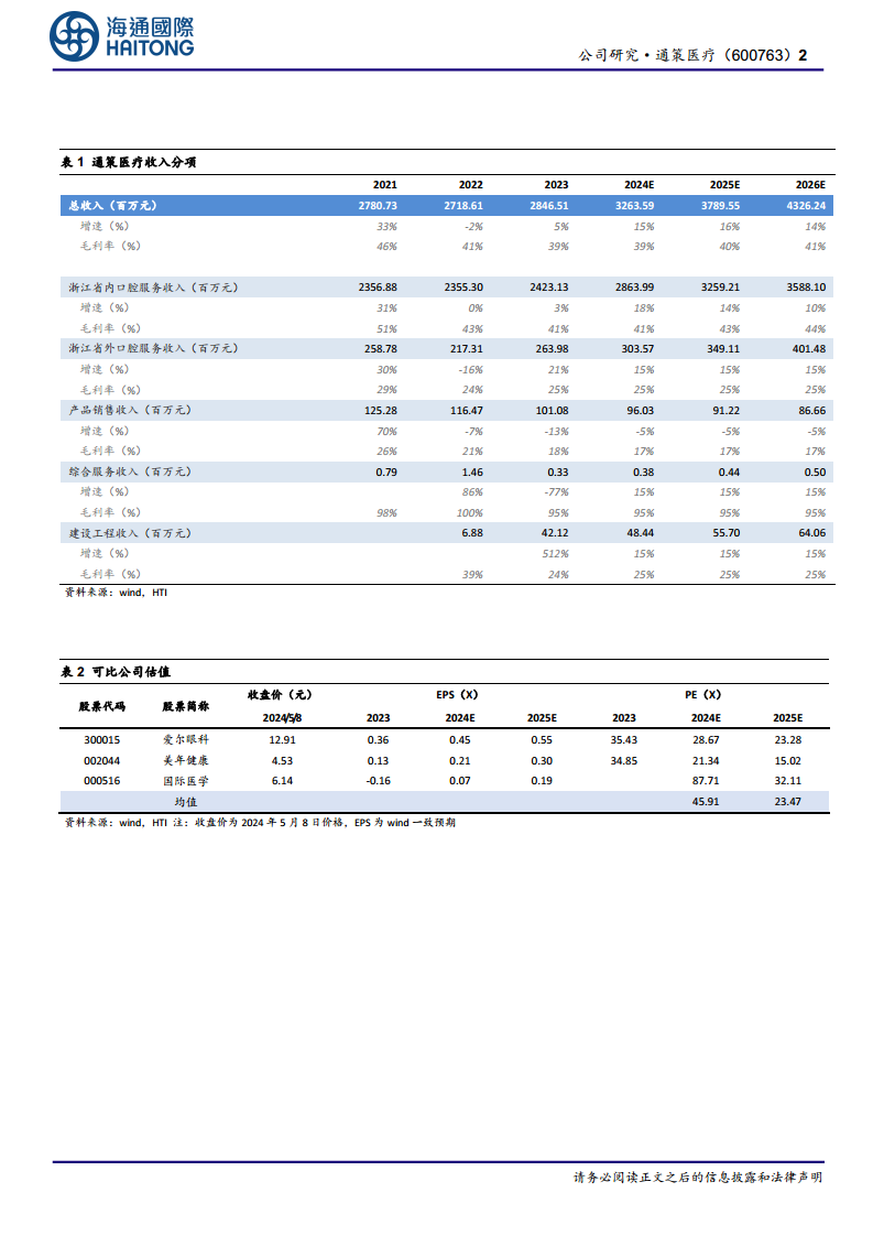 - 估值与评级: 公司依靠杭州口腔医院形成强品牌效应,“区域总院+分院”的发展模式在浙江省内得到验证,并逐步向省内外扩张。参考可比公司估值(爱尔眼科2024E PE 28.67x,美年健康2024E PE 21.34x,国际医学2024E PE 87.71x),给予公司2024年38倍PE,对应目标价71.24元(原目标价126.88元,2023年估值60倍PE,下调44%),维持“优于大市”评级。