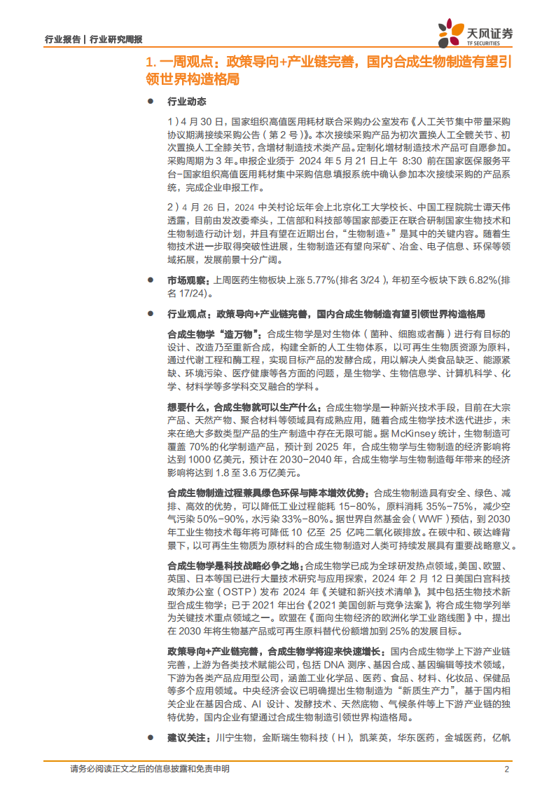 近期行业动态显示,国家层面正积极推动生物制造产业发展。2024年4月30日,国家组织高值医用耗材联合采购办公室发布《人工关节集中带量采购协议期满接续采购公告(第2号)》,明确将增材制造技术类产品纳入采购范围,并允许定制化产品自愿参加,采购周期为3年,申报截止日期为2024年5月21日。此举旨在通过集采机制优化高值耗材市场,同时鼓励先进制造技术的应用。
