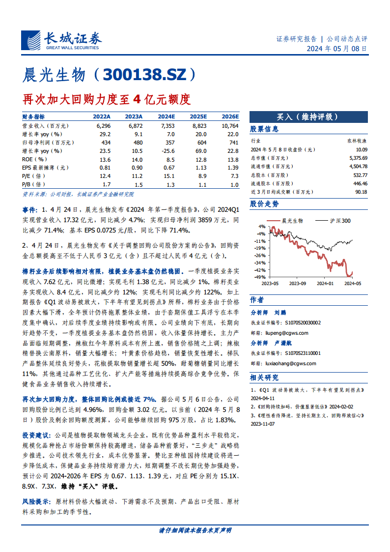 晨光生物2024年第一季度业绩受棉籽业务及套期保值浮亏影响出现短期波动,归母净利润同比大幅下滑。然而,公司的核心植物提取物业务表现稳健,主力产品和梯队产品均实现增长,显示出强大的业务韧性。公司通过加大股份回购力度至4亿元,彰显了对自身价值和未来发展的坚定信心。报告维持“买入”评级,认为晨光生物作为植物提取物领域的龙头企业,具备技术、成本和市场份额等多重优势,短期调整不改长期向好趋势,预计未来盈利能力将显著恢复并持续增长。投资者需关注原材料价格波动、下游需求及出口等潜在风险。