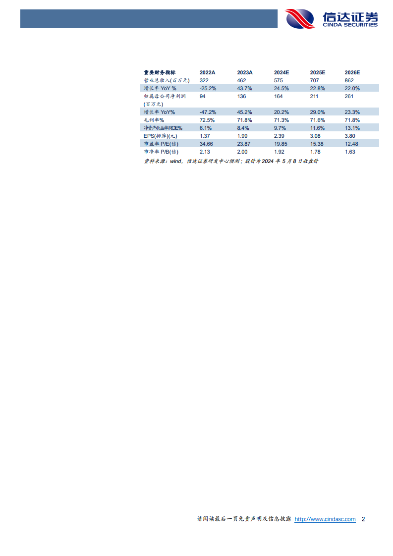 信达证券对伟思医疗的未来业绩进行了预测。预计公司2024年至2026年的营业收入将分别达到5.75亿元、7.07亿元和8.62亿元,同比增速分别为24.5%、22.8%和22.0%。同期,归母净利润预计分别为1.64亿元、2.11亿元和2.61亿元,同比增速分别为20.2%、29.0%和23.3%。根据2024年5月8日的收盘价,对应的预测市盈率分别为20倍、15倍和12倍。