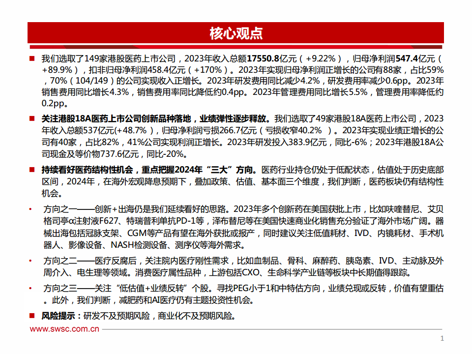 在整体复苏的背景下,港股医药行业呈现出明显的结构性分化。生物药、医疗服务和药店等板块成为主要的增长引擎,特别是18A生物科技公司在创新药出海方面取得突破性进展,不断刷新交易金额,验证了国产创新药的国际竞争力。展望2024年,创新+出海、院内医疗刚性需求以及“低估值+业绩反转”将是三大核心投资方向,同时减肥药和AI医疗等主题性机会也值得关注。