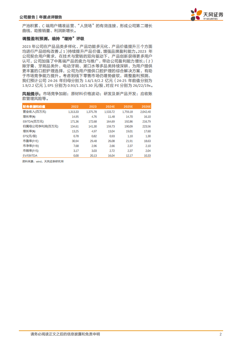 公司在2023年通过产品品类多样化、功能多元化和价值提升,持续改善产品结构,加强中高端产品推广,带动盈利能力增长。考虑到线下零售市场增势疲软,天风证券调整了盈利预测,预计公司2024-2026年归母净利润分别为1.6亿元、1.9亿元和2.2亿元(2024-2025年前值分别为1.9亿元、2.2亿元),对应EPS分别为0.93元/股、1.10元/股和1.30元/股。尽管预测有所下调,但鉴于公司在产品创新、渠道拓展和品牌建设方面的积极进展,维持“增持”评级。