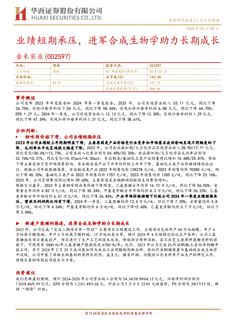 金禾实业在2023年及2024年第一季度受甜味剂及大宗化学品价格大幅下滑影响,业绩短期内面临较大压力,营收和净利润均出现显著下降。然而,公司积极应对市场挑战,通过“定远二期项目”等新建产能的顺利推进,提升了基础化工品和甜味剂的生产能力。更具战略意义的是,公司成功获批D-阿洛酮糖-3-差向异构酶,并依托合成生物学中试线,积极布局非粮生物基材料、益生元等高附加值产品,为公司长期成长注入了新的动能。尽管短期业绩承压,但考虑到公司在产能扩张和合成生物学领域的战略布局,其长期成长潜力值得关注,华西证券维持“增持”评级。