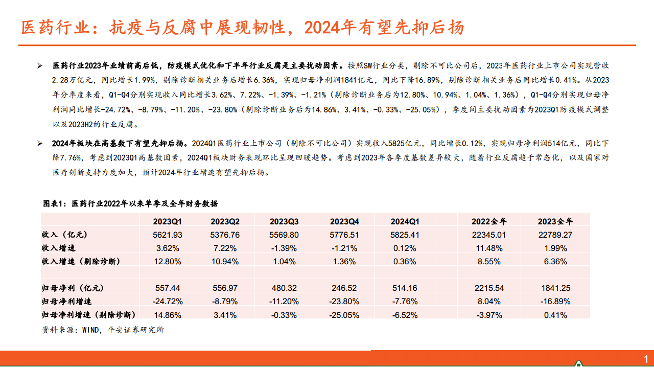 2023年中国医药行业在多重因素影响下,整体业绩呈现前高后低的特点,但剔除诊断业务后仍保持了营收和利润的正增长,展现出行业韧性。进入2024年第一季度,尽管面临高基数挑战,多数子行业已显现出边际改善的趋势。