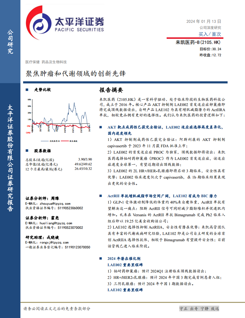 来凯医药成立于2016年,并于2023年6月在香港联交所主板上市(2105.HK),发行价为12.41港元。公司管理层团队资深,主要成员来自诺华生物医学研究所等跨国药企,在药物发现、临床开发和监管流程管理方面拥有丰富经验。公司采取“授权引进+自主研发”的策略,先后从诺华获得四款产品的全球许可,并快速推进至临床阶段。截至2023年6月30日,公司拥有15个候选产品,其中LAE002是全球进度第二的AKT抑制剂,正在进行5项临床试验,包括一项针对铂耐药卵巢癌(PROC)的全球关键注册临床。自主研发的核心管线LAE102(ActRIIA单抗)已进入中美1期临床,具有潜在的增肌减脂和抗肿瘤功效。