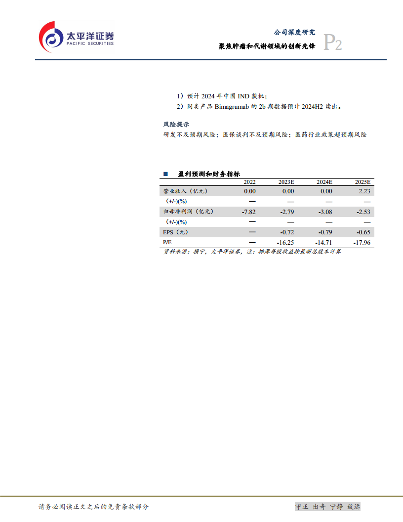2024年,来凯医药预计将迎来多个核心催化剂:LAE002在铂耐药卵巢癌(PROC)适应症上,预计2024年第一季度读出注册临床顶线数据,并计划于2024年提交中国和美国NDA;在HR+/HER2-乳腺癌适应症上,预计2024年中国3期临床将完成首例患者入组;在三阴乳腺癌(TNBC)适应症上,预计2024年中国1期数据读出。LAE102方面,预计2024年中国IND获批,且同类产品Bimagrumab的2b期数据预计2024年下半年读出。