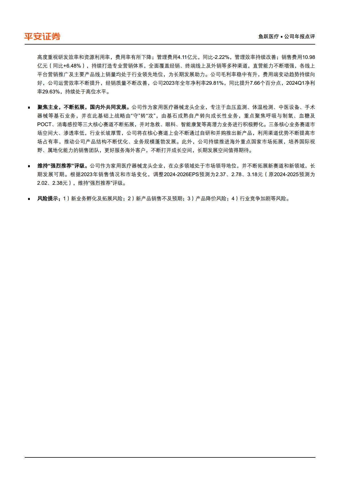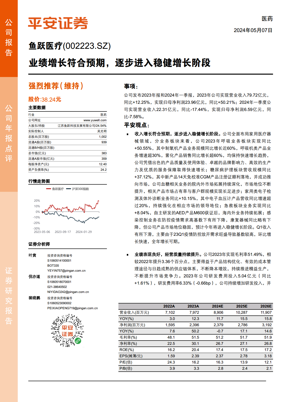 鱼跃医疗在2023年展现出强劲的业绩增长,营业收入和归母净利润均实现显著提升,符合市场预期。公司通过在呼吸、糖尿病护理、家用电子检测等核心业务板块的卓越表现,以及在产品质量、品牌影响力、生产效率和客户服务方面的持续投入,巩固了其市场领导地位。尽管2024年一季度业绩受高基数影响有所波动,但公司通过优化产品结构、提升经营效率、强化研发投入和营销体系,持续改善经营质量。展望未来,鱼跃医疗将战略聚焦于呼吸、血糖及POCT、消毒感控三大核心赛道,并积极孵化高潜力业务,同时大力拓展国内外市场,有望在家用医疗器械领域实现长期稳健增长。