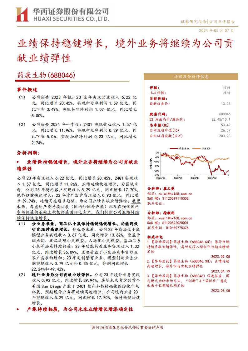 鉴于国内投融资环境趋冷等宏观因素的影响,华西证券对药康生物2024-2026年的盈利预测进行了调整。新的预测显示,2024-2026年营业收入分别为7.71亿元、9.74亿元和12.18亿元,对应每股收益(EPS)分别为0.47元、0.58元和0.73元。尽管预测有所下调,但分析师仍维持“增持”评级,表明对公司长期增长潜力和市场地位的认可。基于2024年05月07日收盘价13.03元/股,调整后的2024-2026年PE分别为28倍、23倍和18倍,反映了市场对公司未来盈利能力的预期。