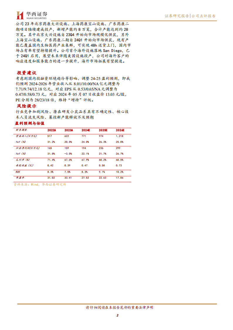 报告中也明确提示了多项潜在风险,包括行业竞争加剧、潜在研发小鼠品系的不确定性、核心技术人员流失以及募投新产能释放不及预期等。这些风险因素可能对公司的经营业绩和市场表现产生不利影响。投资者在做出投资决策时,需充分考虑这些风险,并结合公司自身的风险管理能力进行综合评估。