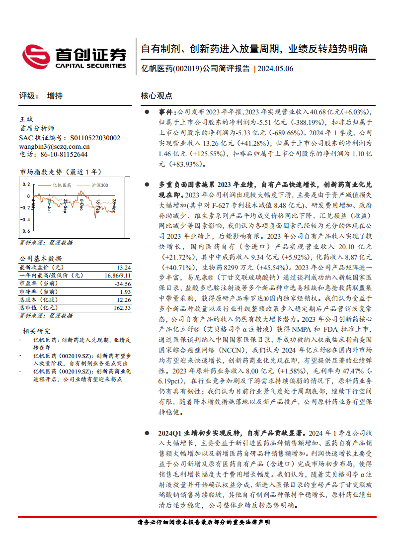 以4月30日收盘价计算,公司2024年至2026年对应的市盈率(PE)分别为32.0倍、21.3倍和15.7倍。鉴于公司明确的业绩反转趋势、创新药的商业化兑现以及自有制剂业务的持续增长潜力,分析师维持对亿帆医药的“增持”评级。